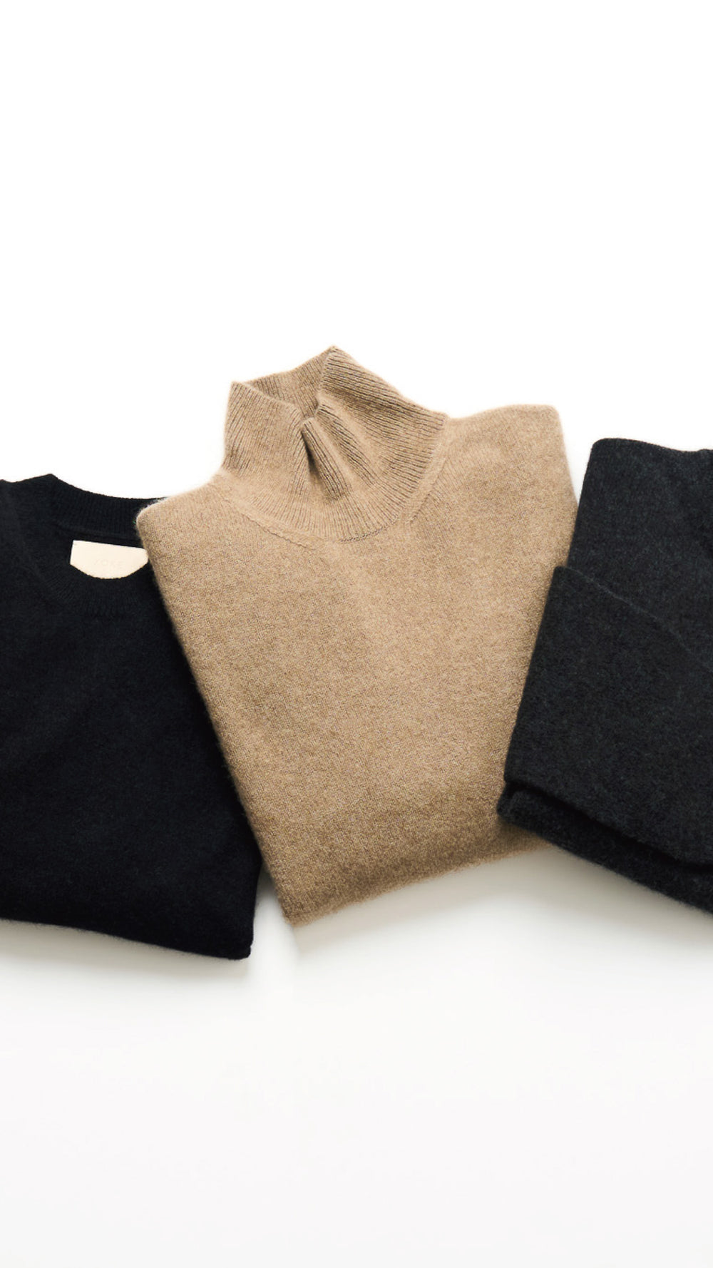 A WHOLEGARMENT knit crafted from a luxurious blend of cashmere and sable — a material considered even more premium than cashmere. Available in two styles: crew neck and turtleneck. Exclusively available at YOKE AOYAMA and our official online store.