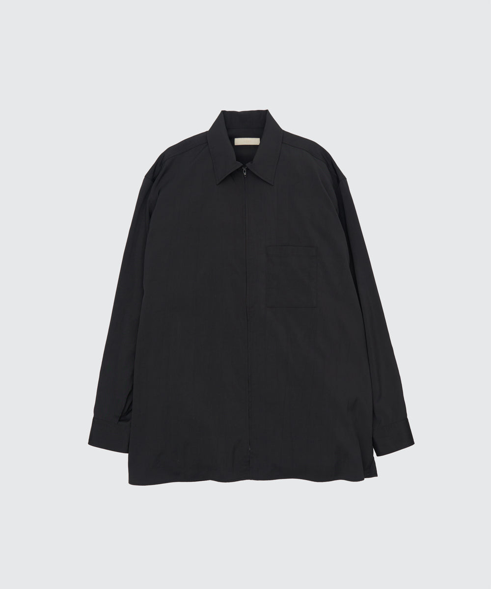 シャツはフロントにジップを配した新型で、ファスナーを隠す仕様により、極限までディテールを抑えたミニマルな印象に。ルーズフィットなシルエットと長めの着丈で、リラックス感を演出しました。ジップを途中まで下ろして、スキッパーのような着こなしもお愉しみいただけます。