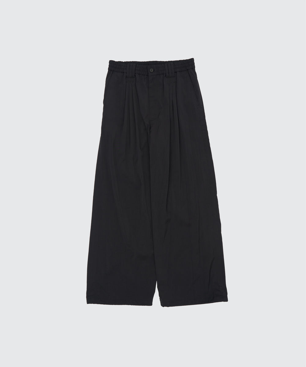イージーパンツは、ワイドテーパードのシルエットに、YOKEの象徴的な3タックを施しました。素材感で上品さも備えつつ、ドローコード仕様の裾、パッカリングを起こす太幅のステッチが加わり、程よく力の抜けた佇まいに仕上げました。