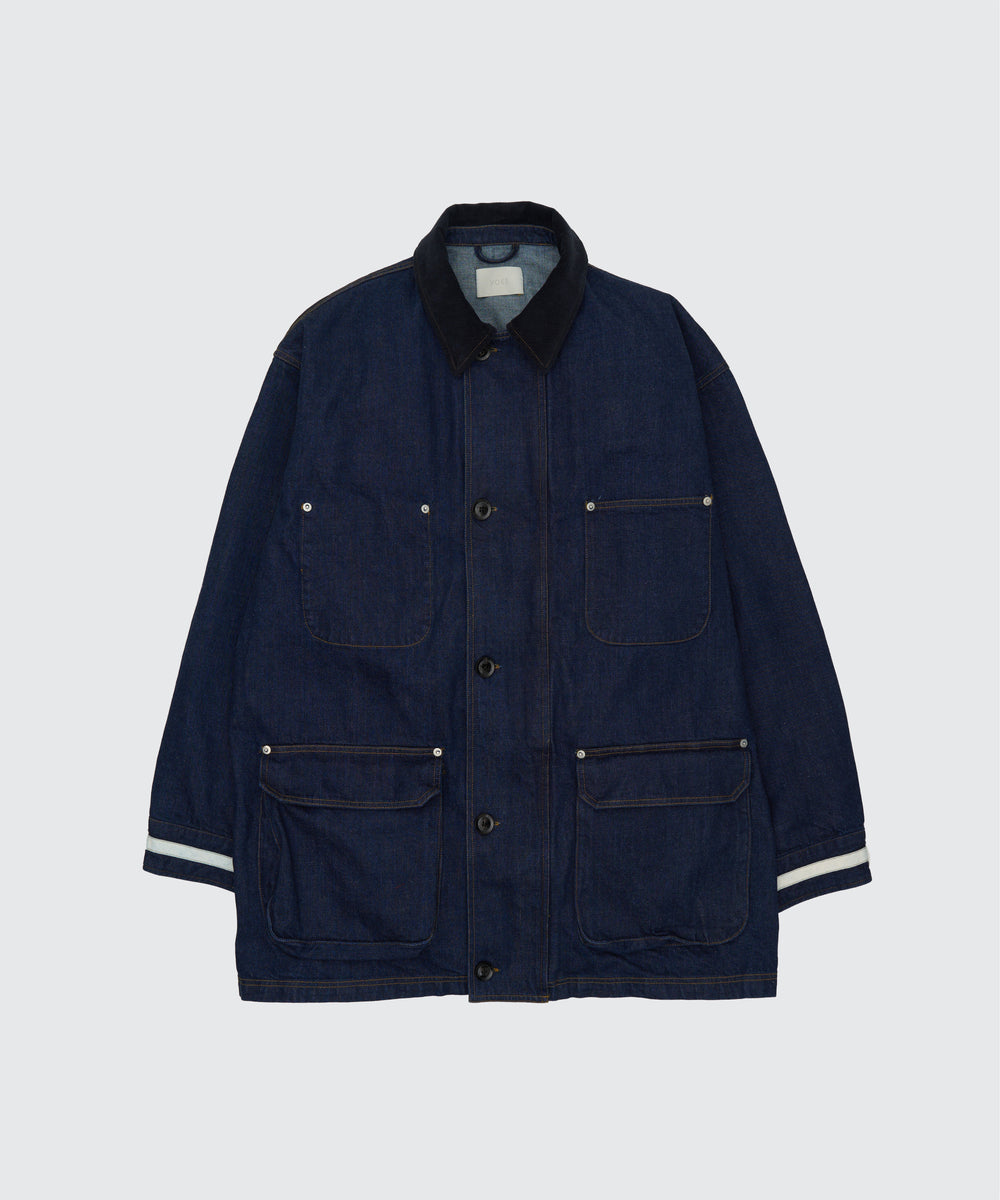 カバーオールは、ヴィンテージのワークウェアをベースに仕立てた新型。コートに用いられる水牛ボタンや、袖口と脇に配した白テープにより、ワークとドレスという異なる要素を融合させ、シュールレアリスム的な違和感を表現しました。オーバーサイズでデフォルメしたシルエットながら、脇下のベンチレーションが可動域を確保。さらに、サイドのボタンやフロントのオリジナル・ダブルジップにより、多彩な着こなしをお愉しみいただけます。