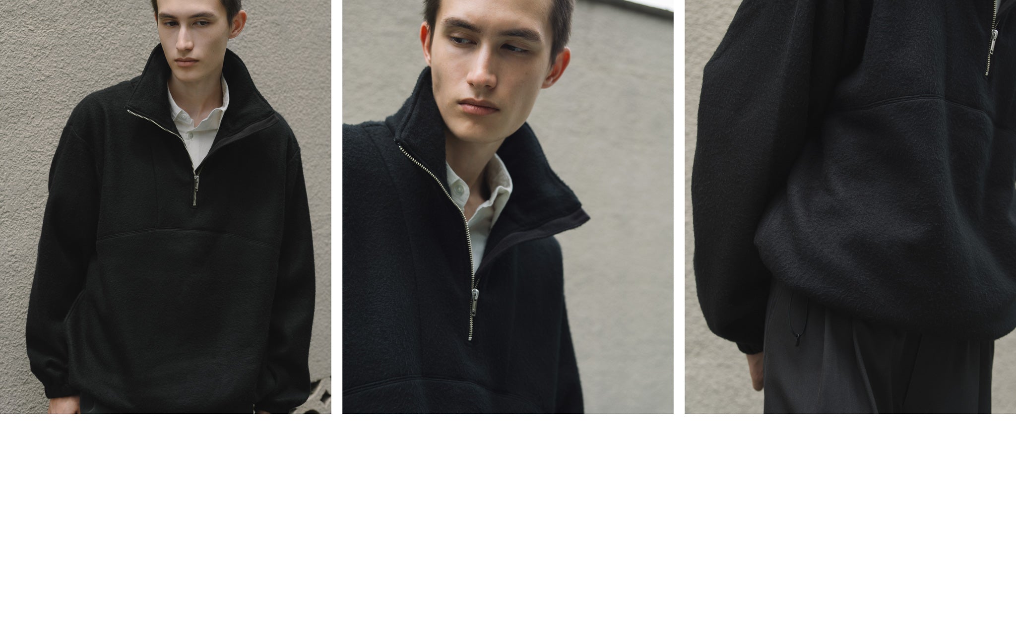 定番のハーフジッププルオーバーは、よりミニマルな印象へとマイナーチェンジ。フロントの切り替えをカーブラインに変更し、ファスナーには金属製を採用することで、スポーティーな印象を抑え、洗練された表情に仕上げました。首元は閉じてスタンドカラーに、開けてシャツやカットソーを覗かせるなど、幅広いスタイリングをお楽しみいただけます。