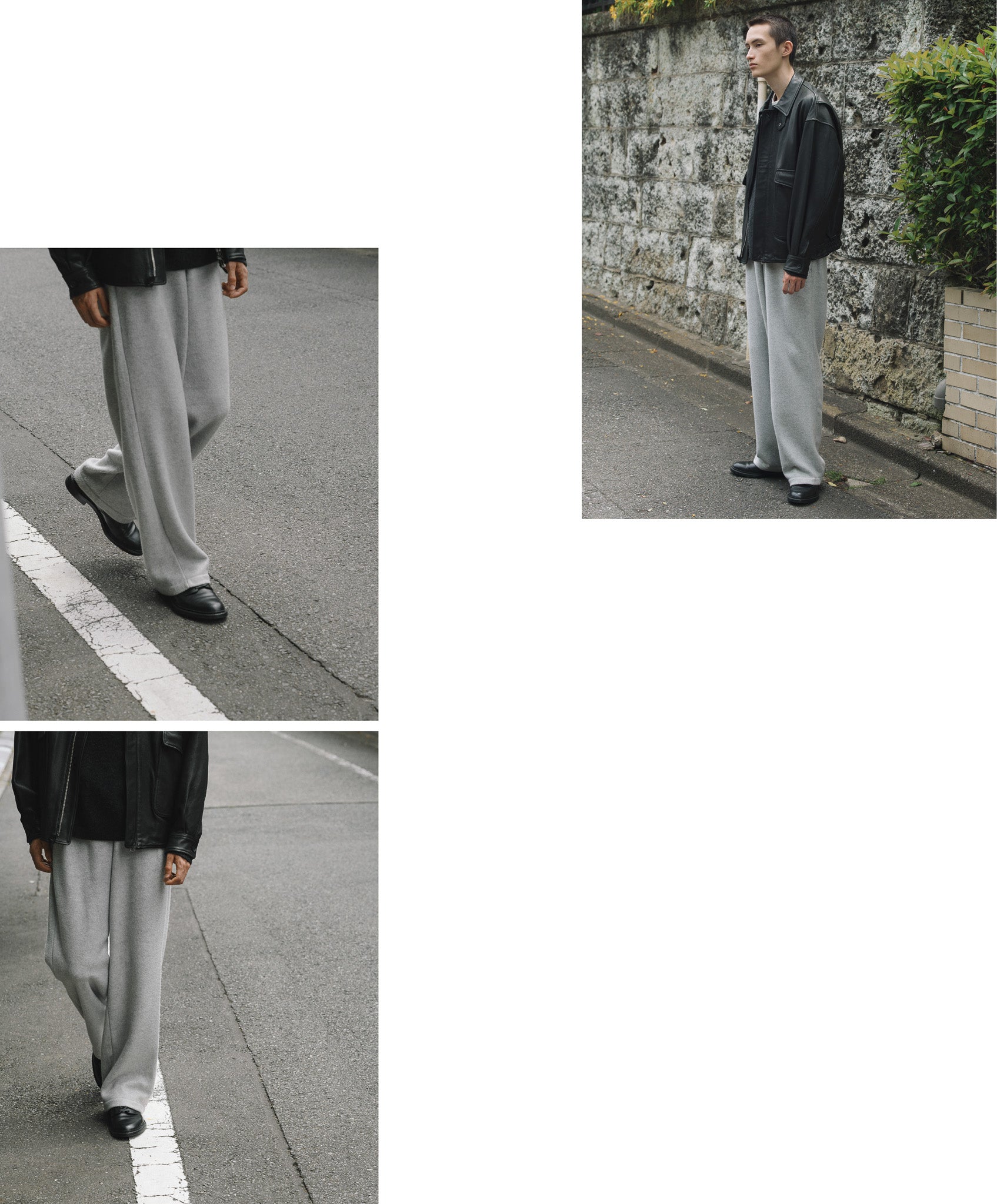 フリースイージーパンツは、ワイドストレートで、リラクシングながらも無駄のないシルエットに。切り替え部分にピスポケットを設けることで、ミニマルながらも品のある佇まいに仕上げました。ウエストは平ゴムと共地のドローコードで調整可能で、ストレスなくご着用いただけます。