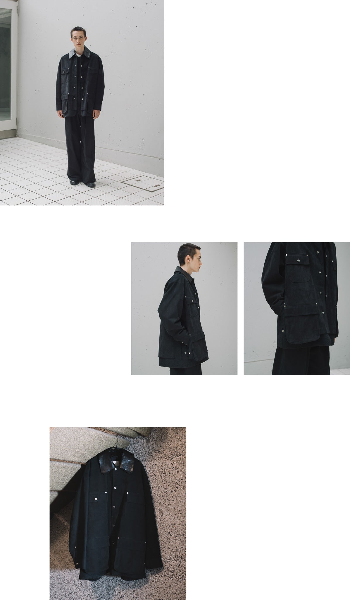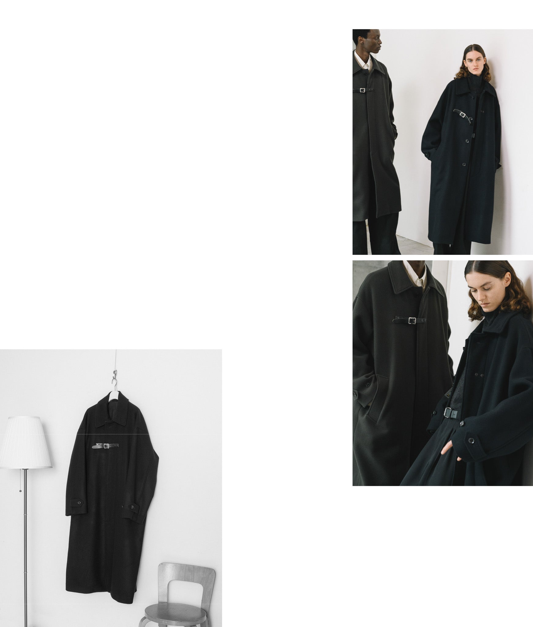 全体的に上質でミニマルな印象に仕上げつつ、フロントのレザーベルトがアクセントに。ベルト部分はドットボタンで取り外すことも可能です。また、襟先のボタンを留めることでスタンドカラーとしてもご着用いただけます。襟裏には異素材の生地を配し、さりげないコントラストが全体の印象を引き締めています。