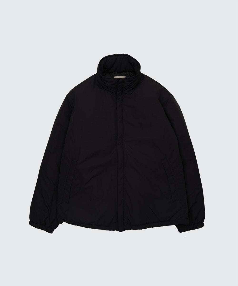 中綿にプリマロフト・ゴールドを使用したナイロンブルゾン。プリマロフトとは、羽毛に代わる高機能な人工中綿素材で、羽毛のような軽さと暖かさに加え、撥水性や、濡れても保温力が落ちにくい機能性、さらに洗濯機で洗えるメンテナンス性の高さが特長です。中でも「プリマロフト・ゴールド」は最高グレードに位置付けられ、繊維が非常に細かく、特に圧縮性と保温性に優れています。表地には、ナチュラルな小ジワを加えたナイロン素材を使用し、撥水加工を施しました。さらに製品洗いとタンブラー仕上げを加えることで、縫い目にパッカリングを生ませ、ふくらみと表情を持たせました。フロントは、前立てを設けることでファスナーが隠れる仕様にし、ディテールを抑えたミニマルな印象に。裾にはドローコードを配し、シルエットの調整も可能です。