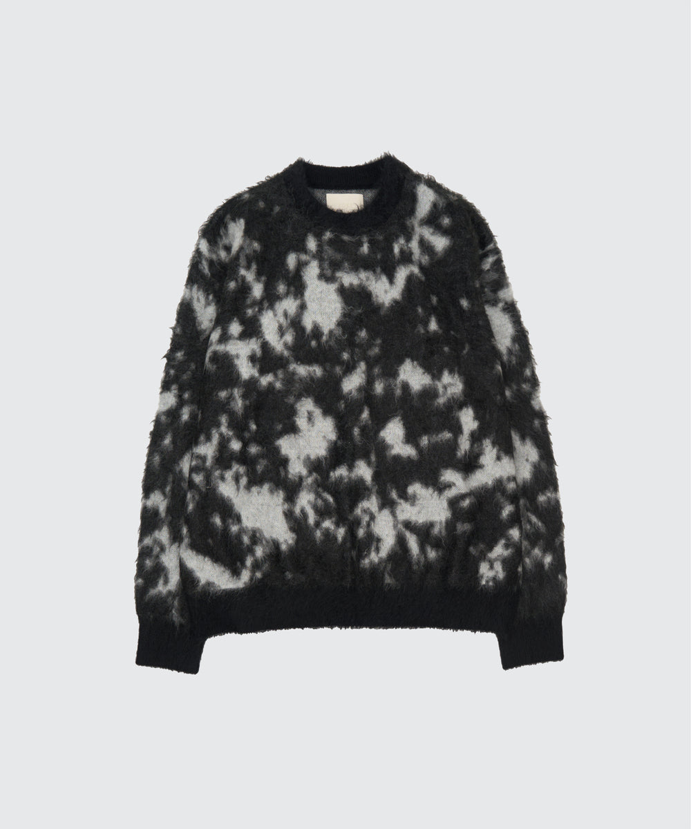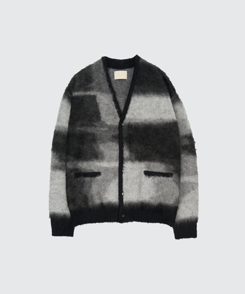 毎シーズン展開してるジャガードモヘアセーターとカーディガン。今シーズンはマン・レイの1920年代に製作された映像作品の一瞬を切り抜いたような抽象的なグラフィックをモノトーンで落とし込みました。素材には、細くしなやかで光沢感のあるスーパーキッドモヘアを主原料とし、毛足のあるタムタムヤーンを採用。ボリューム感と保温性を兼ね備えたニットに仕上げました。前シーズンに引き続き、ゆったりとしたリラックス感のあるシルエットに。カーディガンのフロントには、YOKEの刻印入りの貝ボタンを使用しています。