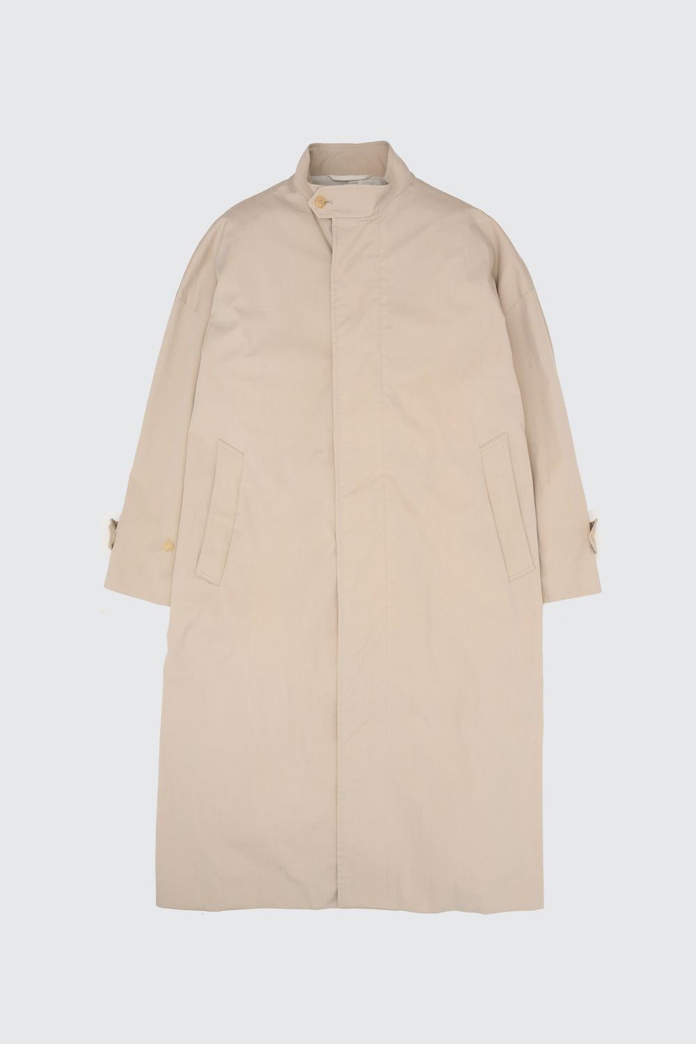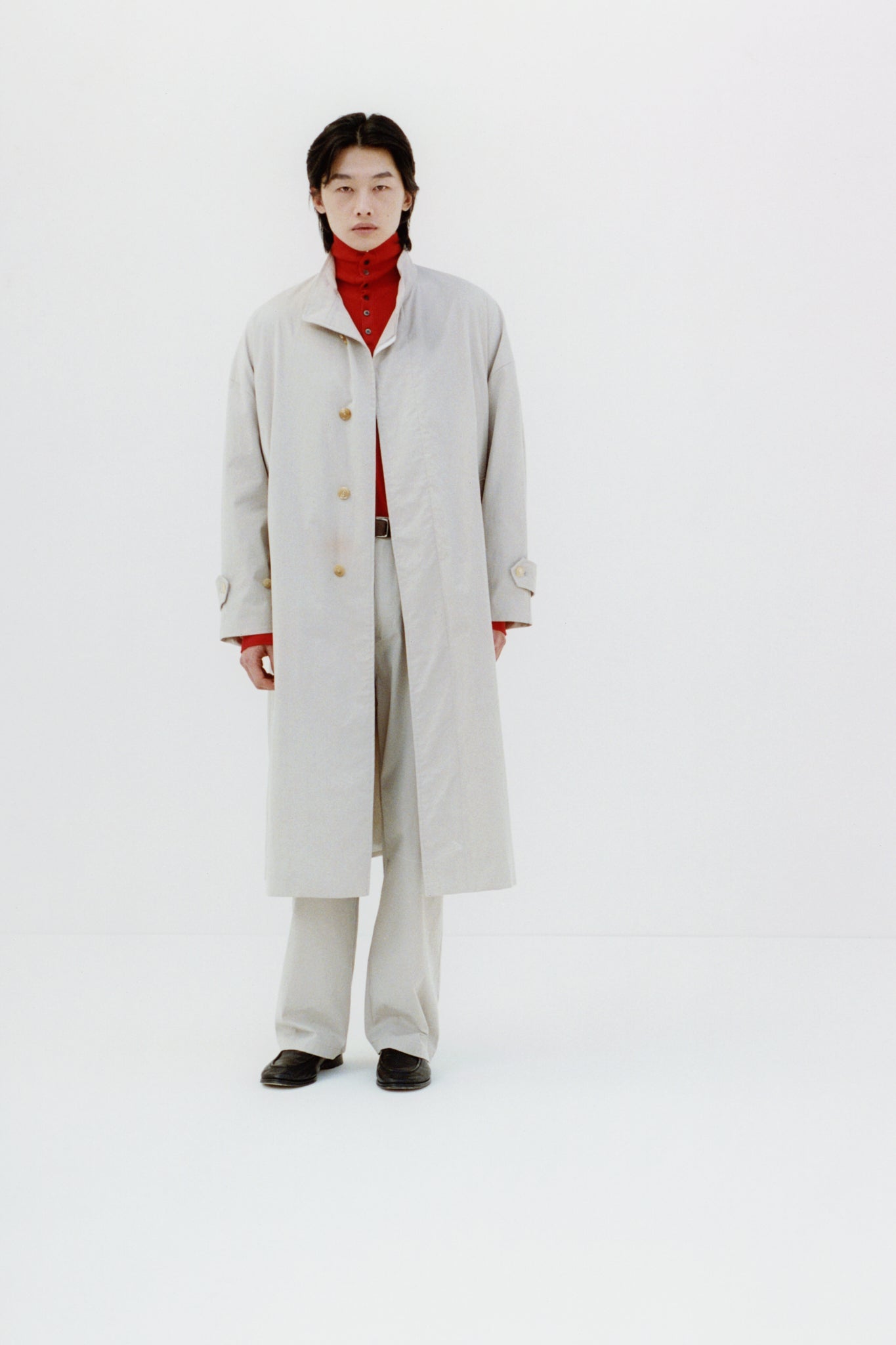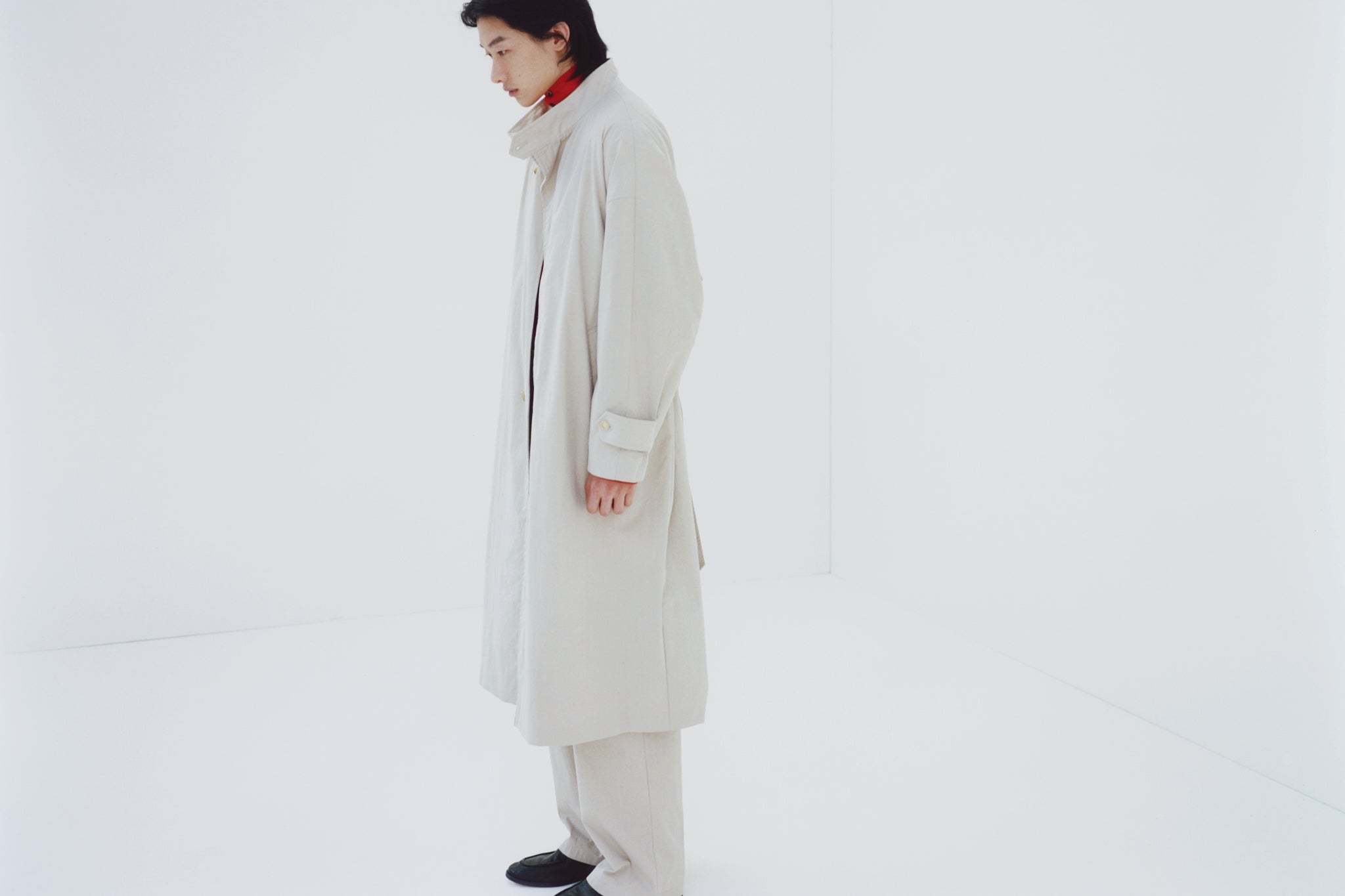 コットンナイロンのヴィンテージツイルを使用した、スタンドカラーオーバーコートとワイドテーパードトラウザーズ。バイオ加工と長時間のタンブラー仕上げにより、ハリを砕いたぬめり感と膨らみ、ヴィンテージライクなシボ感を表現しています。