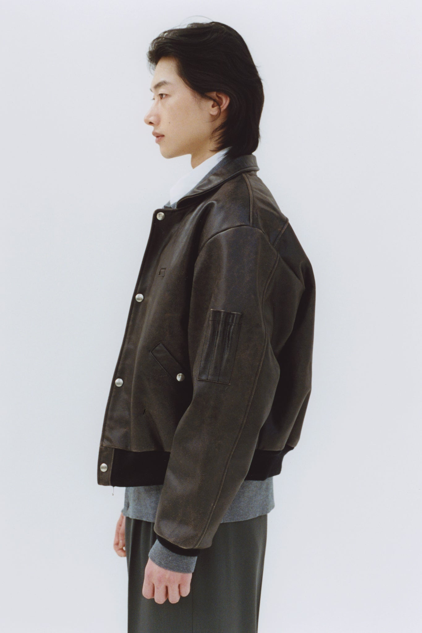 クラック加工を施したカウレザーを使用したフライトジャケット。A-2由来の小ぶりな衿やリブ仕様に、MA-1を思わせるドットボタン付きポケットを組み合わせたミックス感のあるデザインです。腰上のショート丈に、身幅と袖巾を広く取ったシルエットで、衿は立てても寝かせても着用可能。下地染色後にクラック顔料を施した牛革は、経年変化のような割れ感と色の奥行きを表現しています。