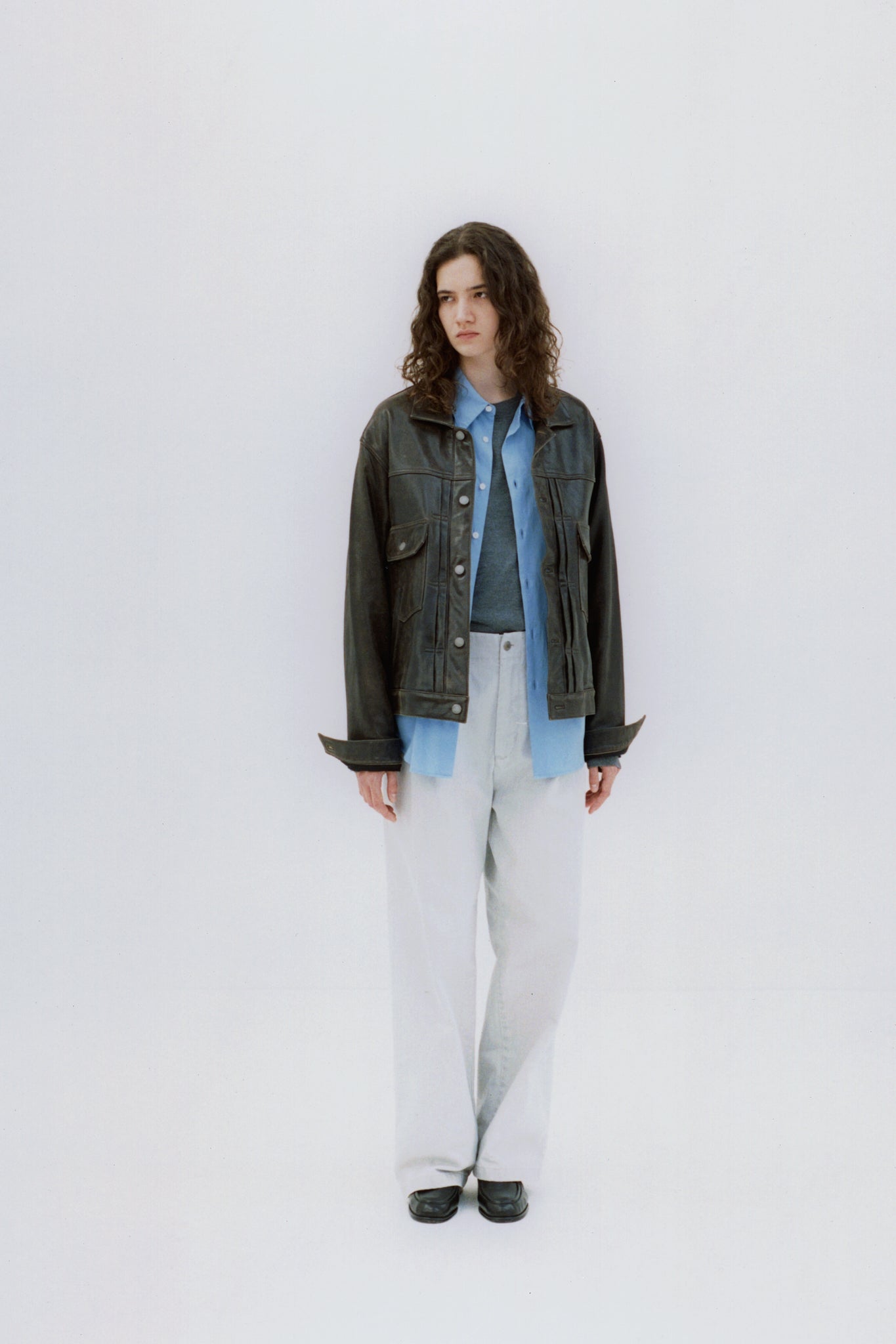 クラック加工を施したシープレザーを使用したトラッカージャケット。リーバイス 2ndモデルをベースに現代的にルーズなパターンへ調整し、片玉縁の腰ポケットを加えることで機能性を高めています。ロゴ入りネオバボタンを採用し、マックス・エルンストの「グラッタージュ」から着想を得た、削り出すようなクラック表現が特徴。着用を重ねることで顔料が剥がれ、経年変化を楽しめます。下地染色後にクラック顔料を施した羊革は、柔らかく軽やかな着心地と、奥行きのあるヴィンテージライクな表情を備えています。