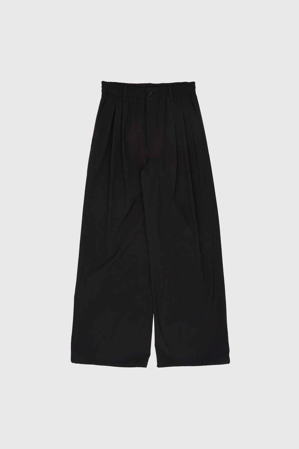 イージートラウザーズは、深めに入れたアウトタックと、太めの平ゴム+スピンドル仕様のウエストにより、リラックス感と安定した穿き心地を両立。太過ぎず細過ぎないストレートシルエットで、幅広いスタイリングに馴染む一本です。