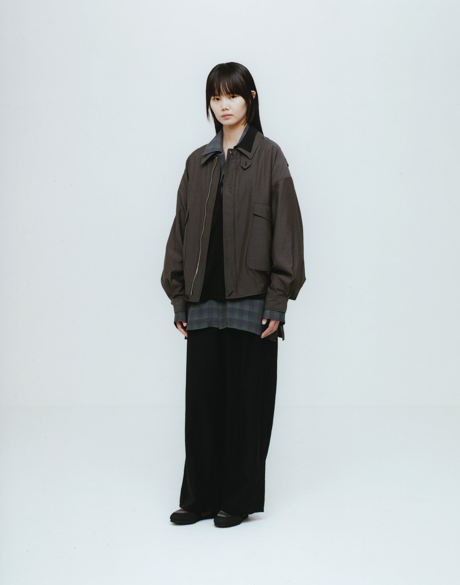 デザインはA-2の要素をベースにしながら、よりミニマルな方向へ再構築。袖口と裾のリブを排し共地仕様とし、後ろ身頃の裾は平ゴムで絞り、前身頃にはボタンで調整可能なタブを設けています。腰ポケットは通常よりも大きく設定し、アクションプリーツによって可動域を確保。衿には着脱可能なチンタブを配し、機能性と端正さを両立させた一着です。