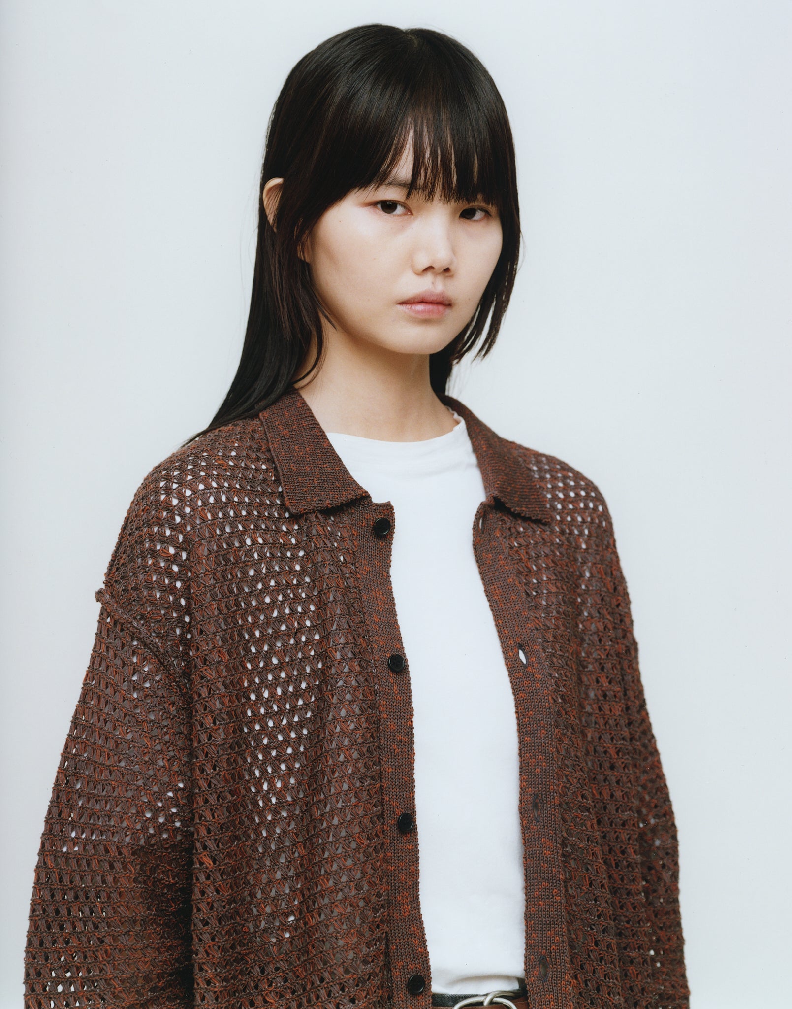 クルーネックは、ミニマルな佇まいの中に素材の表情と通気性を際立たせたデザイン。メッシュ編みによる軽やかさと、天竺編みで縁取った各パーツが、全体を引き締めています。