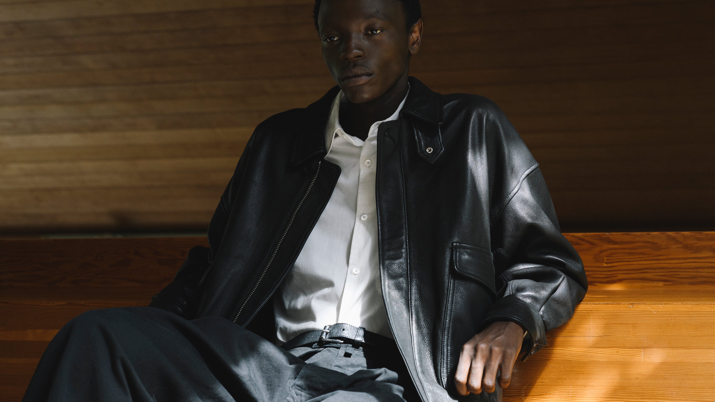 24FW同型のレザーフライトジャケット。ミリタリーのA-2をベースにしながら、カジュアルさをそぎ落とし、よりミニマルに仕上げました。袖口と裾のリブを共地に切り替えることで、すっきりとした印象に。後ろ裾には平ゴムで絞りを加え、前裾にはボタンで調整可能なタブを配置しました。腰ポケットは通常よりも大きくデザインし、アクションプリーツによって可動域を広げています。衿には着脱可能なチンタブを備え、ディテールにも機能性を持たせました。シボが強く厚みのある牛革を使用しており、傷や汚れにも強く、タフに着こなせる一着です。