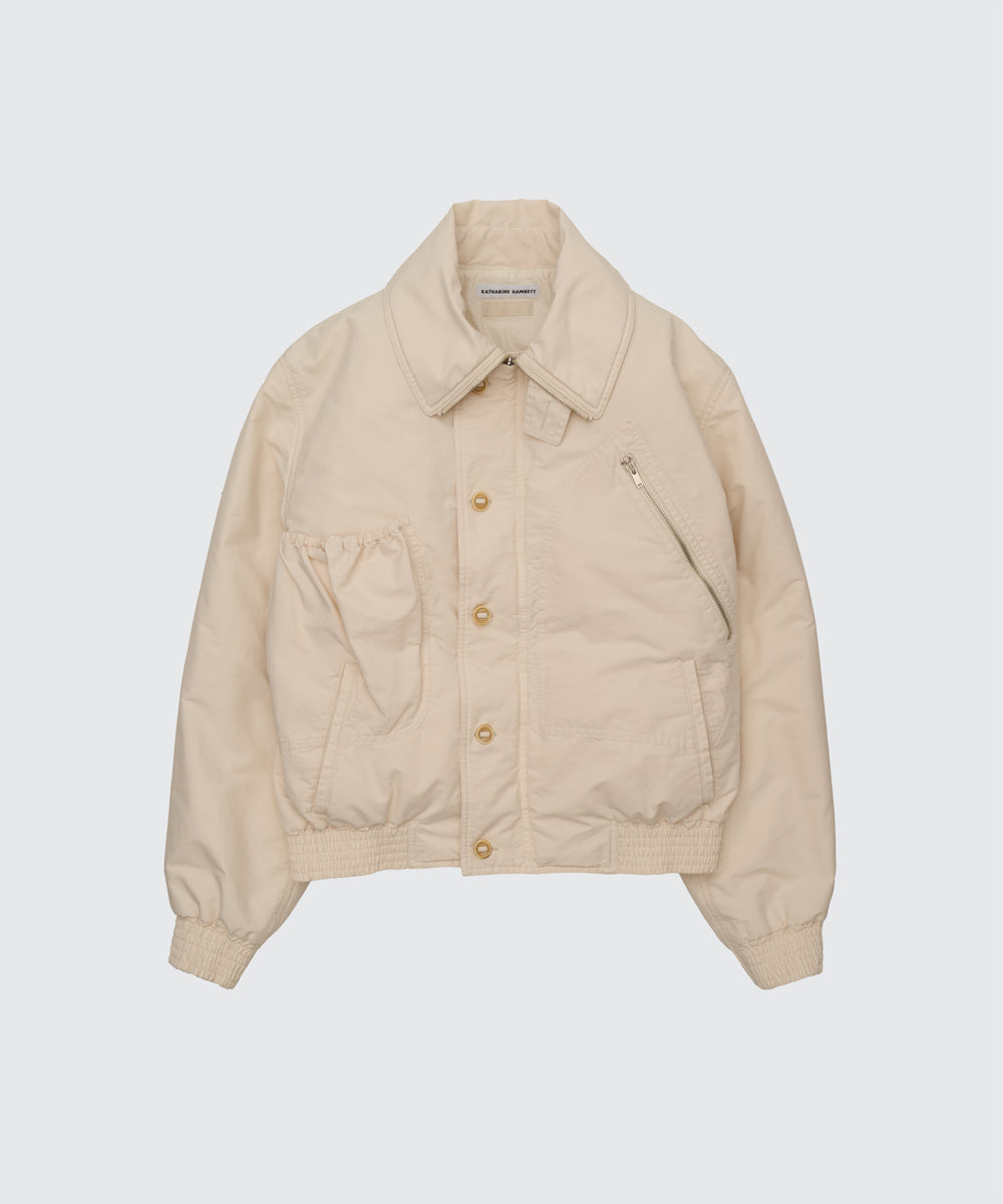 リサイクルナイロンを使用したフライトジャケット。オリジナルのミリタリー要素は生かしつつ、大ぶりな胸ポケットとフラップ下に隠れる腰ポケットを追加。袖口には、"KATHARINE HAMNETT"のシグネチャーデザインである曲線的なリブカッティングを取り入れました。素材には撥水加工を施したリサイクルナイロンのMA-1ツイルを使用。3M™ シンサレート™ 高機能中綿を採用することで、しっかりとした保温性を確保しつつ、軽やかな着心地を実現しました。