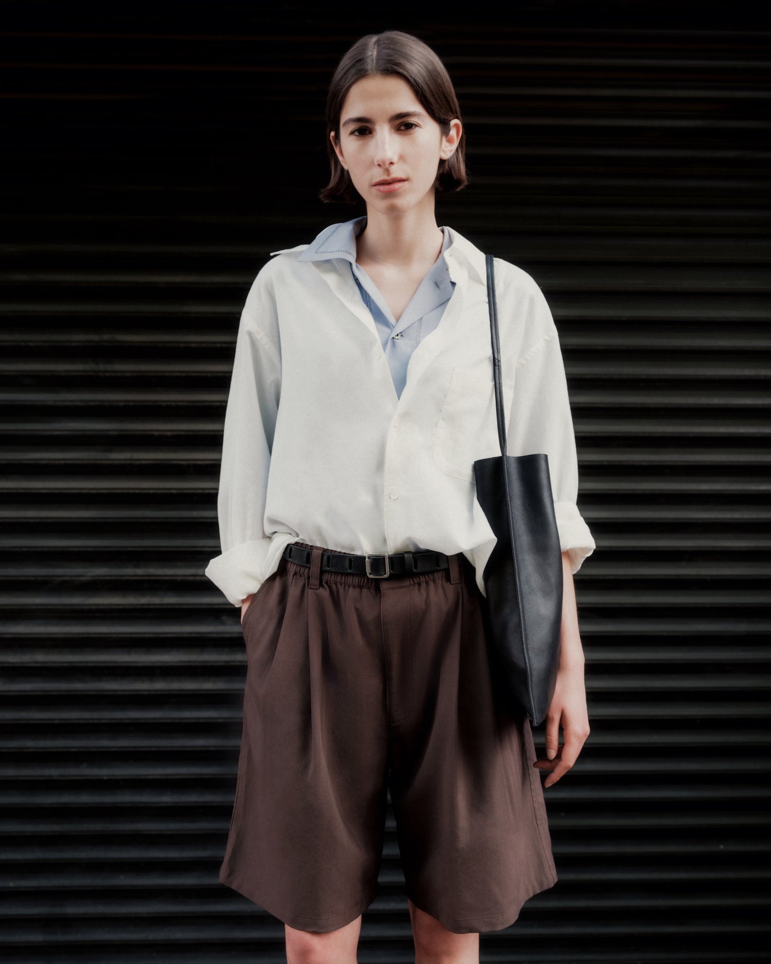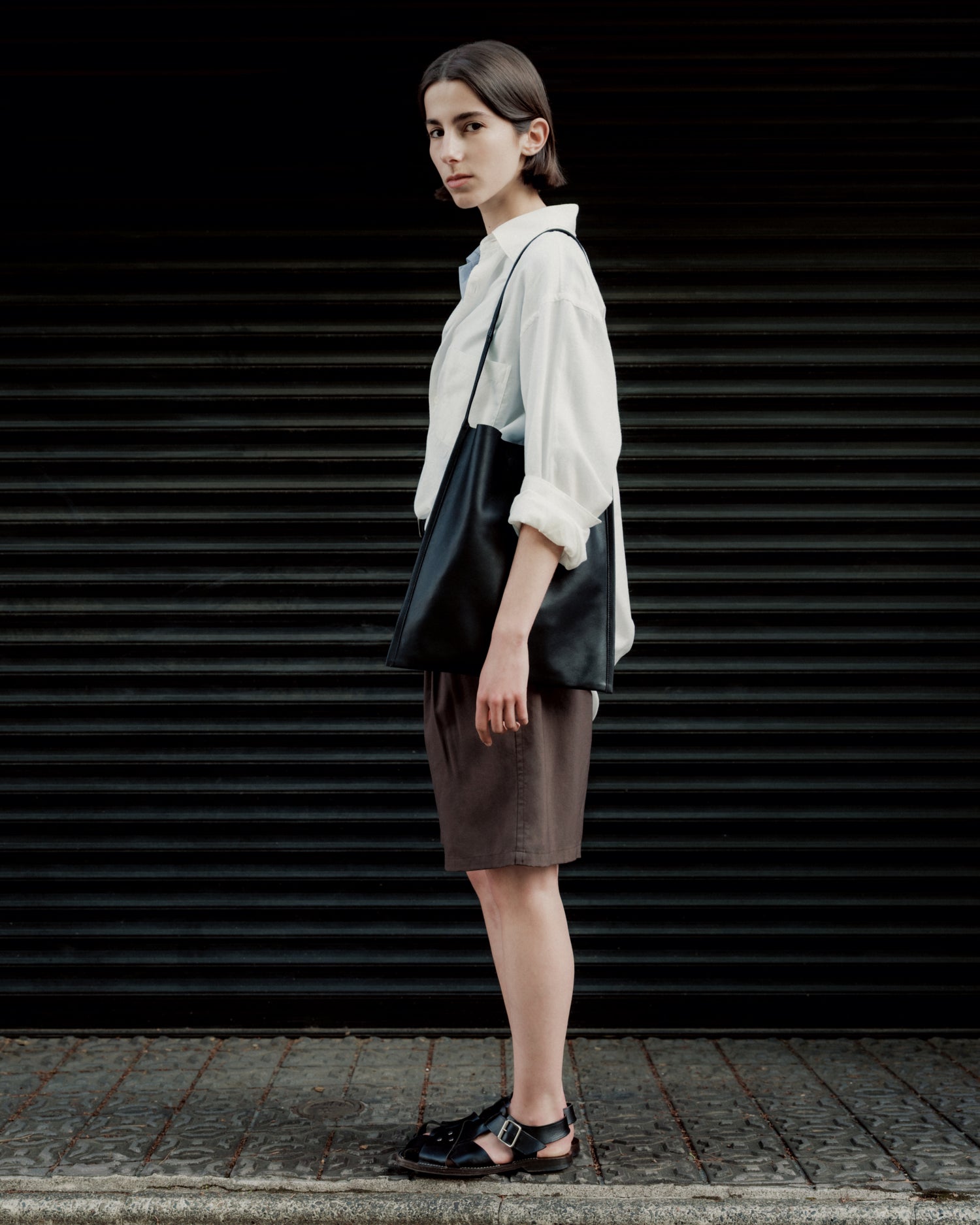 マチを付けずにフラットなシルエットにすることで、シャープさを追求したショルダーバッグ。サイドのパイピングの延長線上にショルダーストラップが続くデザインで、開け口はカットオフで仕上げ、削ぎ落とされた印象に。「Morphée」を象徴するマグネットボタンで開閉可能で、スマートフォンがちょうど入るサイズの内ポケット付き。A4サイズの書類や13インチのMac Bookが収まる容量で、通勤用にも最適。