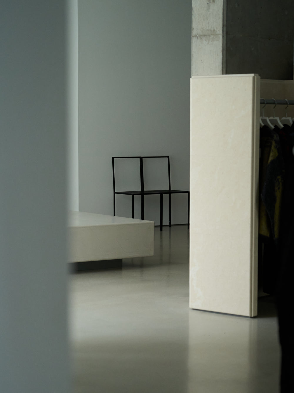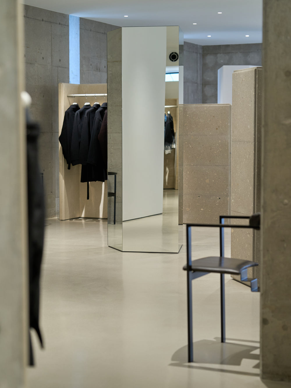 Hanger rack fixtures made of four types of stone are randomly placed like objects.The mirror is also an object that creates space by making it a distorted four-sided column.
