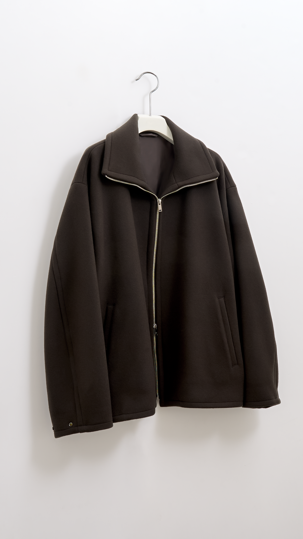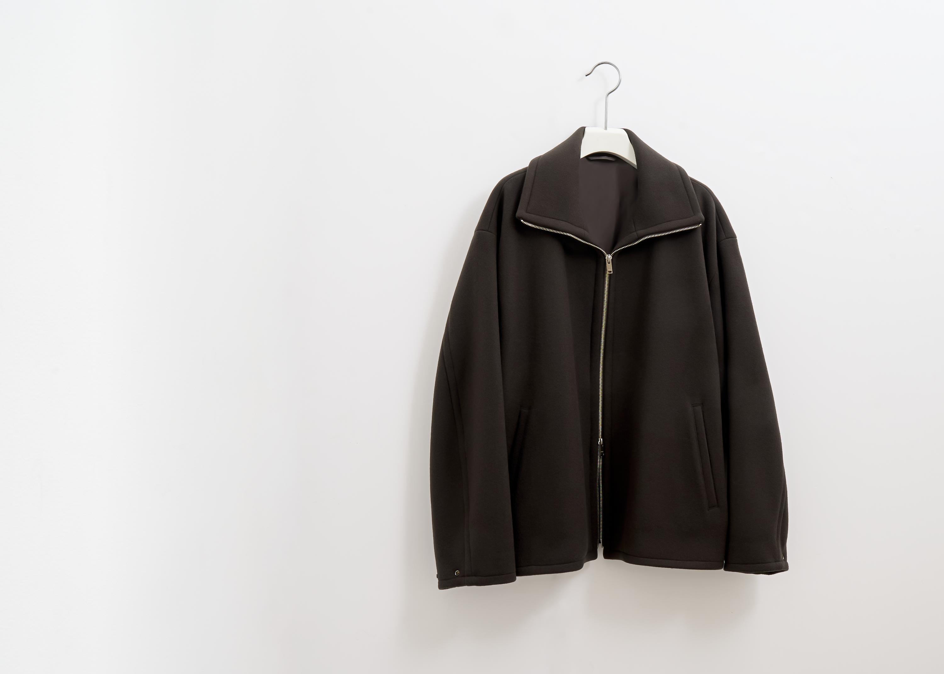 A stand-collar overcoat available exclusively at our flagship stores. Made from a luxurious angora wool fabric, it features a soft, supple touch and a refined luster. The material is densely woven and carefully brushed to highlight angora’s natural elegance. The design is clean from the front with a concealed placket, while the back showcases a generous drape. Voluminous dolman sleeves add shape to the silhouette. The matching waist belt lets you tighten the roomy body for a more defined look.